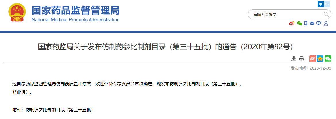 關(guān)于發(fā)布仿制藥參比制劑目錄(第三十五批)的通告(2020年第92號)