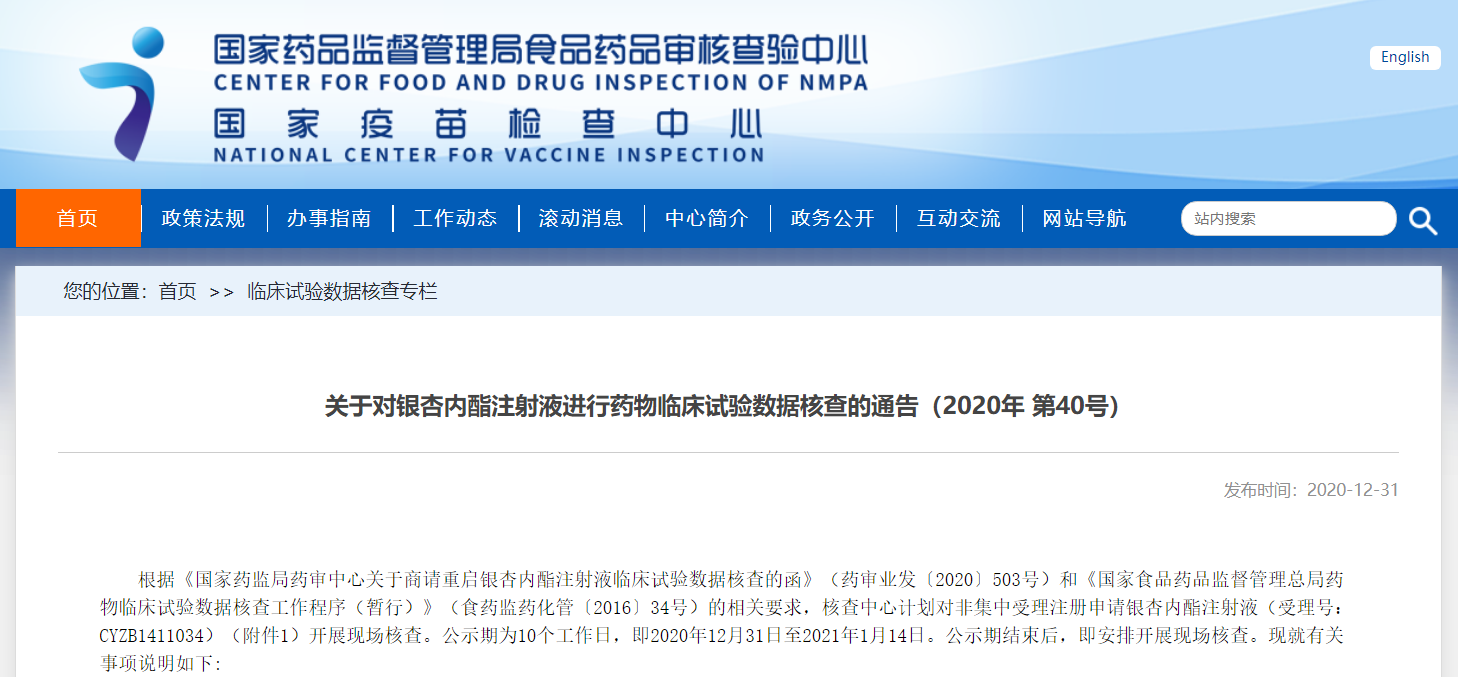 關(guān)于對銀杏內(nèi)酯注射液進行藥物臨床試驗數(shù)據(jù)核查的通告(2020年 第40號)