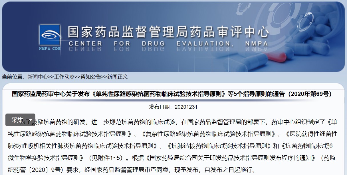 關(guān)于發(fā)布《單純性尿路感染抗菌藥物臨床試驗技術(shù)指導(dǎo)原則》等5個指導(dǎo)原則的通告(2020年第69號)