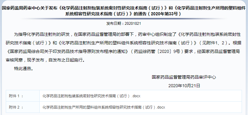 ? 國家藥監(jiān)局藥審中心關(guān)于發(fā)布《化學(xué)藥品注射劑包裝系統(tǒng)密封性研究技術(shù)指南(試行)》和《化學(xué)藥品注射劑生產(chǎn)所用的塑料組件系統(tǒng)相容性研究技術(shù)指南(試行)》的通告(2020年第33號)