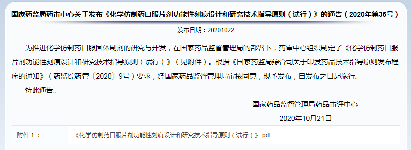? 國家藥監(jiān)局藥審中心關(guān)于發(fā)布《化學(xué)仿制藥口服片劑功能性刻痕設(shè)計和研究技術(shù)指導(dǎo)原則(試行)》的通告(2020年第35號)