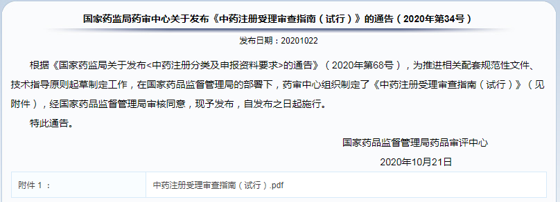 ? 國家藥監(jiān)局藥審中心關(guān)于發(fā)布《中藥注冊受理審查指南(試行)》的通告(2020年第34號)