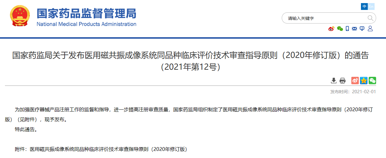 關(guān)于發(fā)布醫(yī)用磁共振成像系統(tǒng)同品種臨床評價技術(shù)審查指導(dǎo)原則(2020年修訂版)的通告(2021年第12號)
