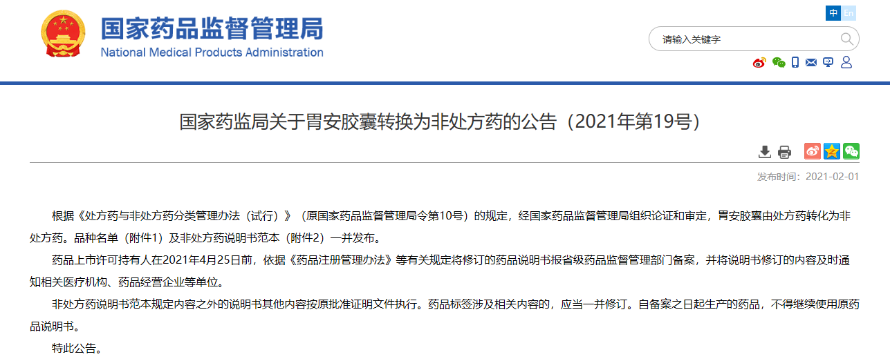 關(guān)于胃安膠囊轉(zhuǎn)換為非處方藥的公告(2021年第19號)