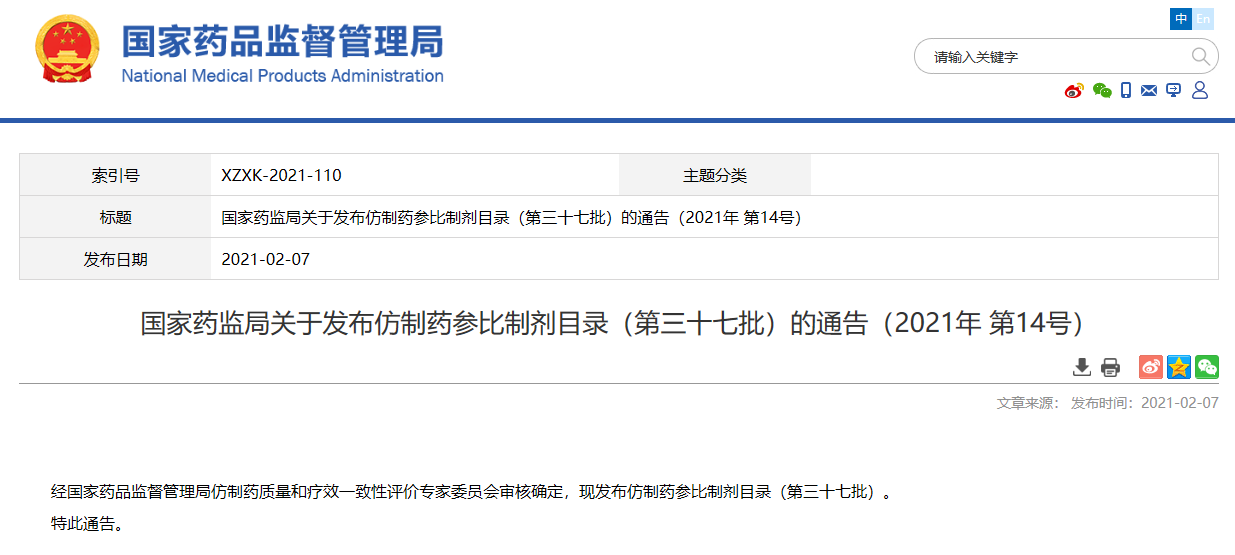 關(guān)于發(fā)布仿制藥參比制劑目錄(第三十七批)的通告(2021年 第14號)
