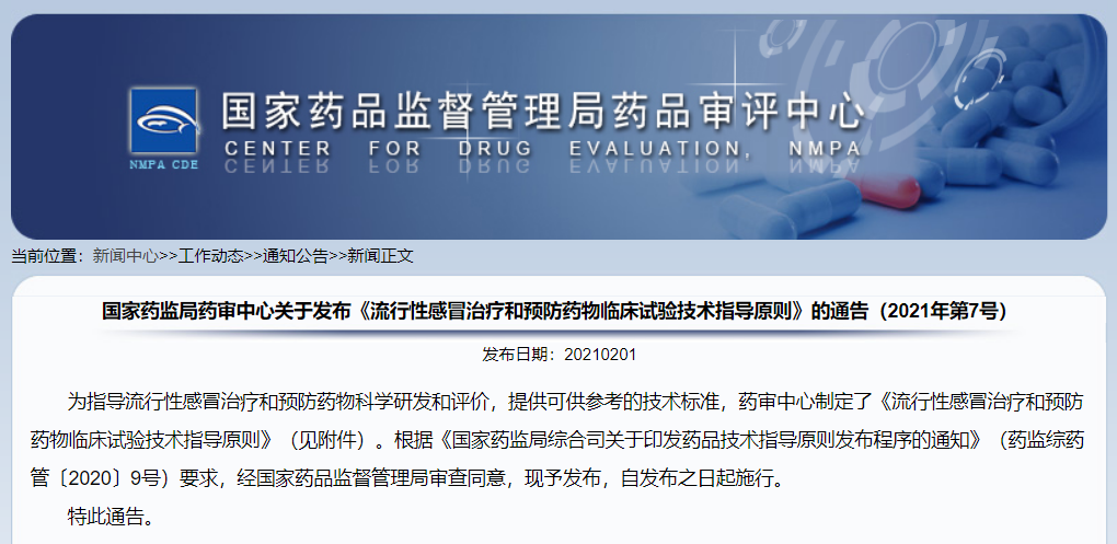 關(guān)于發(fā)布《流行性感冒治療和預(yù)防藥物臨床試驗技術(shù)指導(dǎo)原則》的通告(2021年第7號)