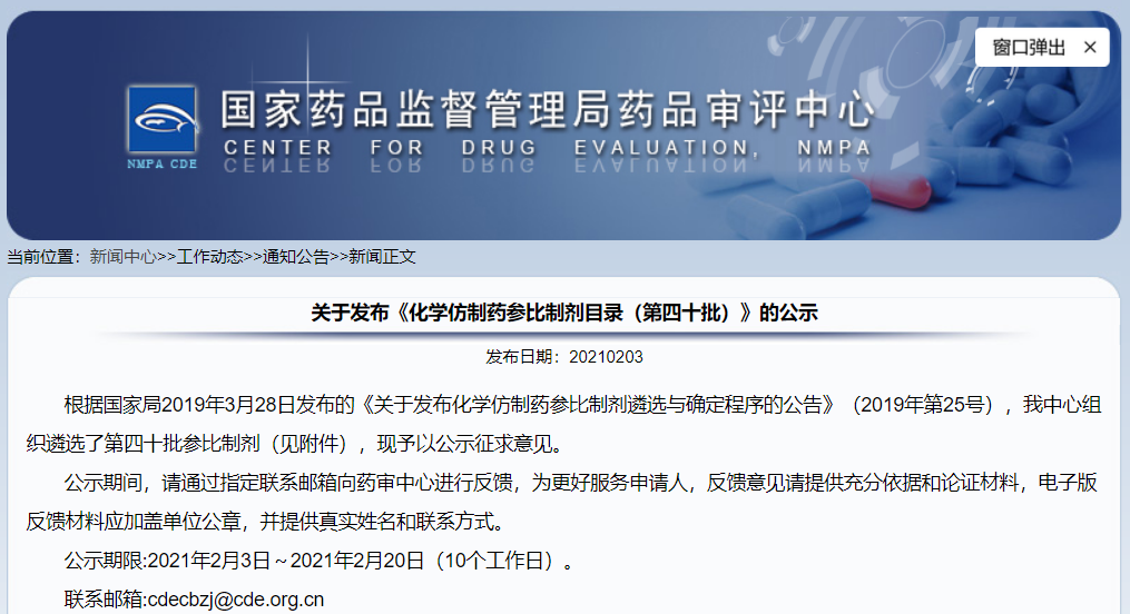 關(guān)于發(fā)布《化學(xué)仿制藥參比制劑目錄(第四十批)》的公示