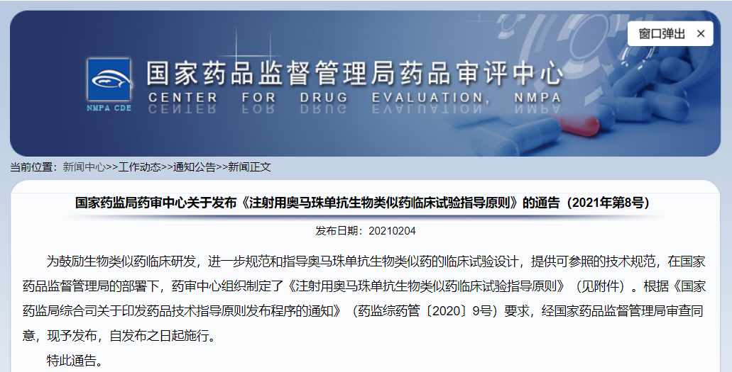 關(guān)于發(fā)布《注射用奧馬珠單抗生物類似藥臨床試驗指導(dǎo)原則》的通告(2021年第8號)