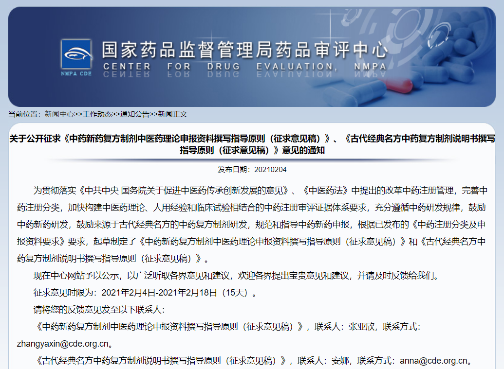 關(guān)于公開征求《中藥新藥復(fù)方制劑中醫(yī)藥理論申報資料撰寫指導(dǎo)原則(征求意見稿)》、《古代經(jīng)典名方中藥復(fù)方制劑說明書撰寫指導(dǎo)原則(征求意見稿)》意見的通知