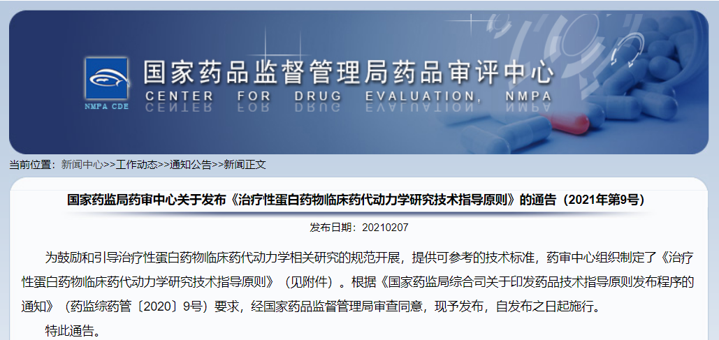 關(guān)于發(fā)布《治療性蛋白藥物臨床藥代動力學(xué)研究技術(shù)指導(dǎo)原則》的通告(2021年第9號)