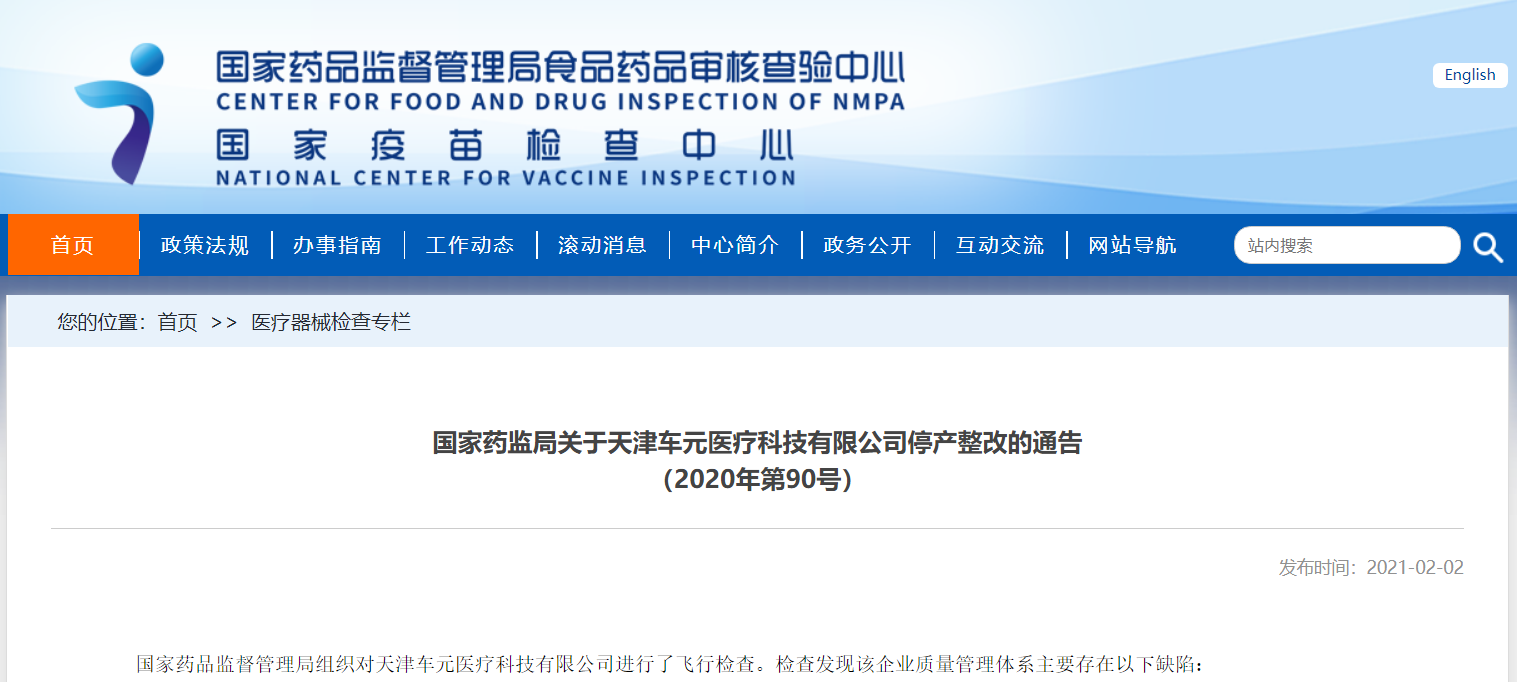 關(guān)于天津車元醫(yī)療科技有限公司停產(chǎn)整改的通告(2020年第90號)