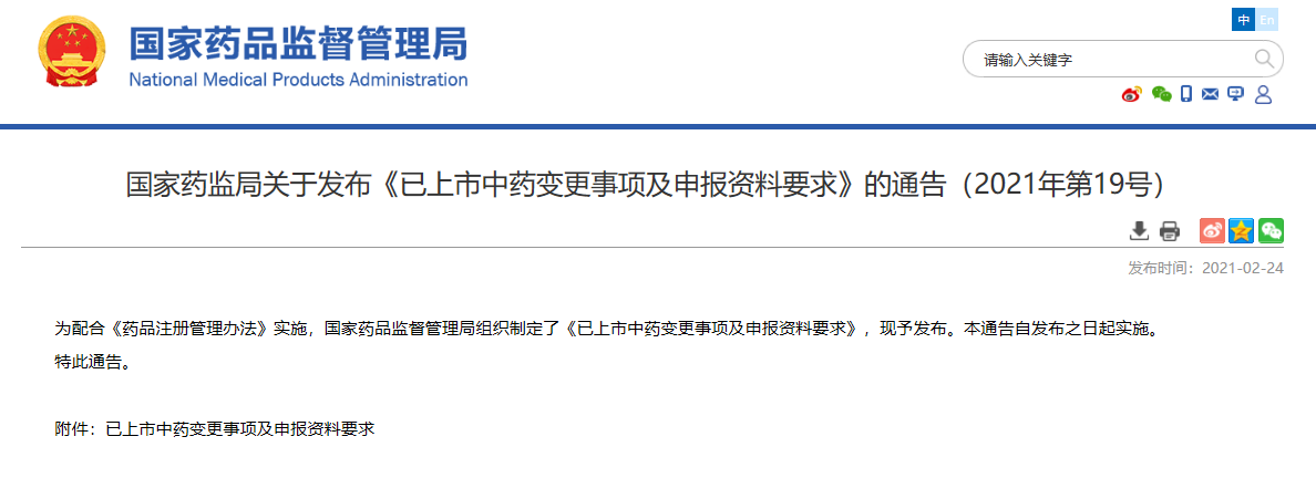關(guān)于發(fā)布《已上市中藥變更事項(xiàng)及申報資料要求》的通告(2021年第19號)