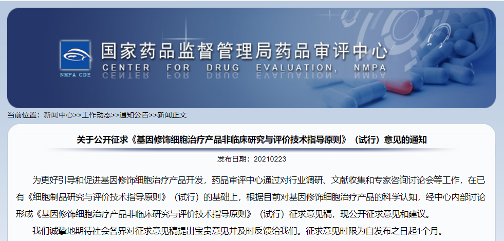 關(guān)于公開征求《基因修飾細(xì)胞治療產(chǎn)品非臨床研究與評價技術(shù)指導(dǎo)原則》(試行)意見的通知