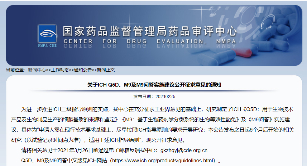 關(guān)于ICH Q5D、M9及M9問答實(shí)施建議公開征求意見的通知