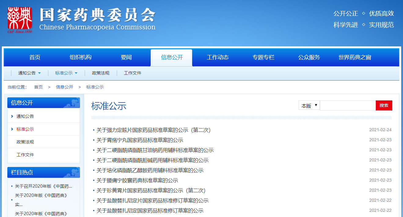 本周珍黃胃片、強(qiáng)力定眩片、胃瘍寧丸國家藥品標(biāo)準(zhǔn)草案的公示;腰痛寧膠囊藥典標(biāo)準(zhǔn)草案公示;培化磷脂酰乙醇胺、二硬脂酰磷脂酰膽堿、二硬脂酰磷脂酰甘油鈉藥用輔料標(biāo)準(zhǔn)草案的公示;鹽酸替扎尼定、鹽酸替扎尼定片國家藥品標(biāo)準(zhǔn)修訂草案的公示。