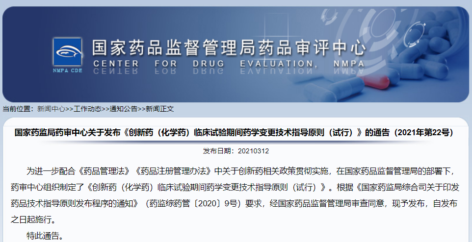 關(guān)于發(fā)布《創(chuàng)新藥(化學(xué)藥)臨床試驗(yàn)期間藥學(xué)變更技術(shù)指導(dǎo)原則(試行)》的通告(2021年第22號)