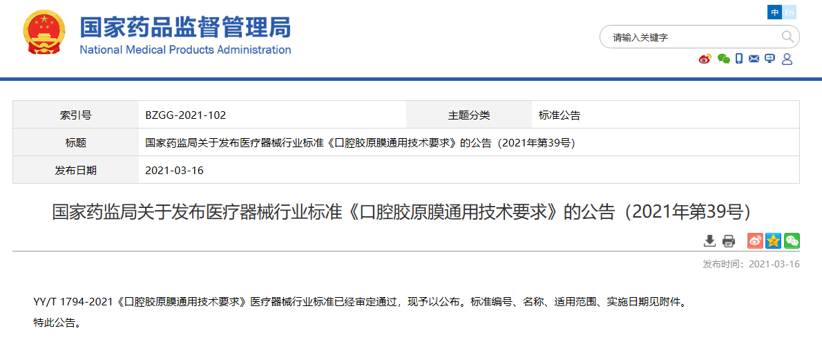 關(guān)于發(fā)布醫(yī)療器械行業(yè)標(biāo)準(zhǔn)《口腔膠原膜通用技術(shù)要求》的公告(2021年第39號)