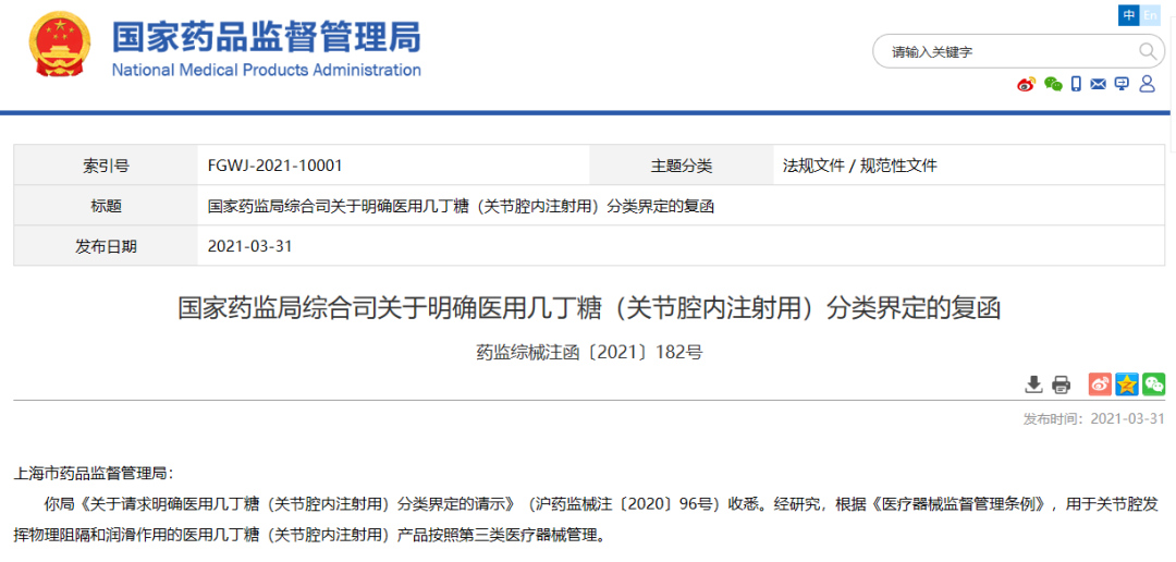 國家藥監(jiān)局綜合司關(guān)于明確醫(yī)用幾丁糖(關(guān)節(jié)腔內(nèi)注射用)分類界定的復(fù)函(2021-03-31)