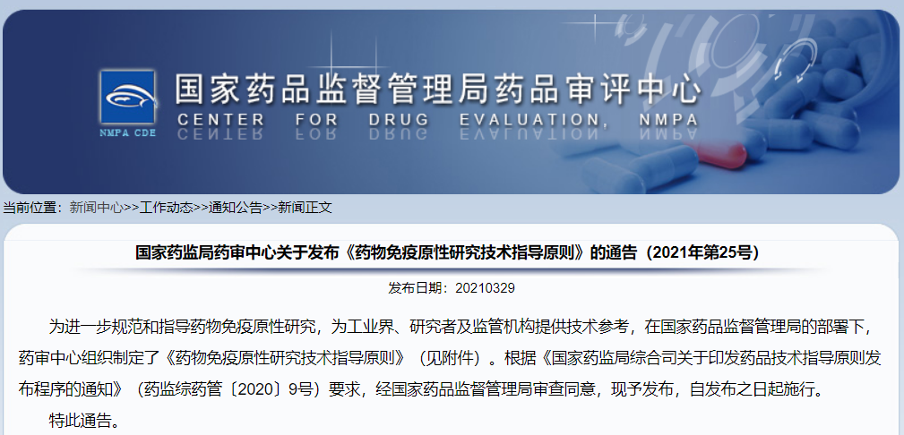 國家藥監(jiān)局藥審中心關(guān)于發(fā)布《藥物免疫原性研究技術(shù)指導(dǎo)原則》的通告(2021年第25號(hào))