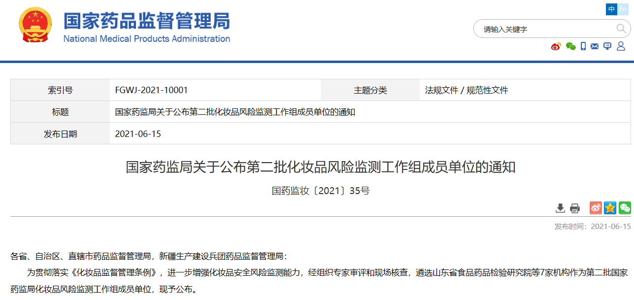 國家藥監(jiān)局關(guān)于公布第二批化妝品風(fēng)險(xiǎn)監(jiān)測工作組成員單位的通知