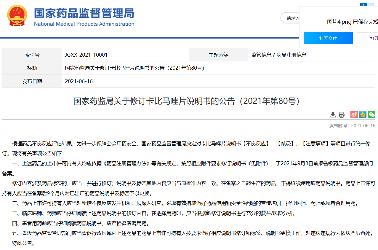 國家藥監(jiān)局關(guān)于修訂卡比馬唑片說明書的公告(2021年第80號)