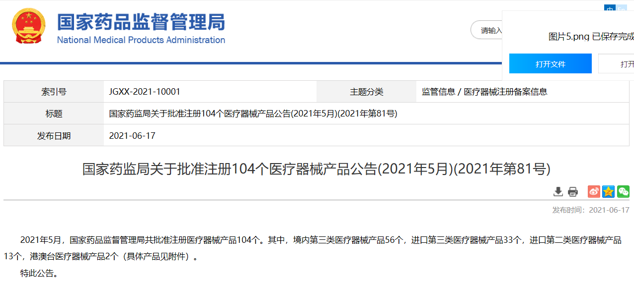 國家藥監(jiān)局關(guān)于批準(zhǔn)注冊104個(gè)醫(yī)療器械產(chǎn)品公告(2021年5月)(2021年第81號)