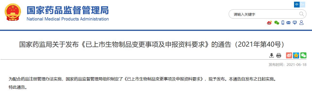 國家藥監(jiān)局關(guān)于發(fā)布《已上市生物制品變更事項(xiàng)及申報(bào)資料要求》的通告(2021年第40號)