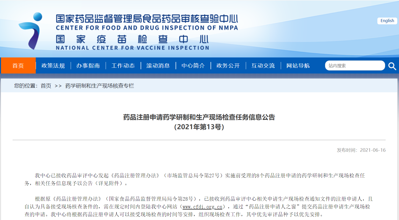 藥品注冊申請藥學(xué)研制和生產(chǎn)現(xiàn)場檢查任務(wù)信息公告(2021年第13號)
