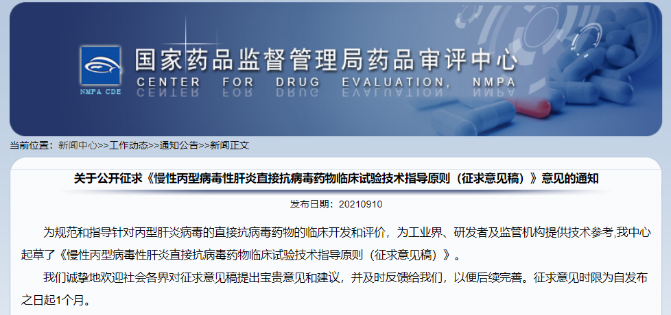 關(guān)于公開征求《慢性丙型病毒性肝炎直接抗病毒藥物臨床試驗技術(shù)指導原則(征求意見稿)》意見的通知