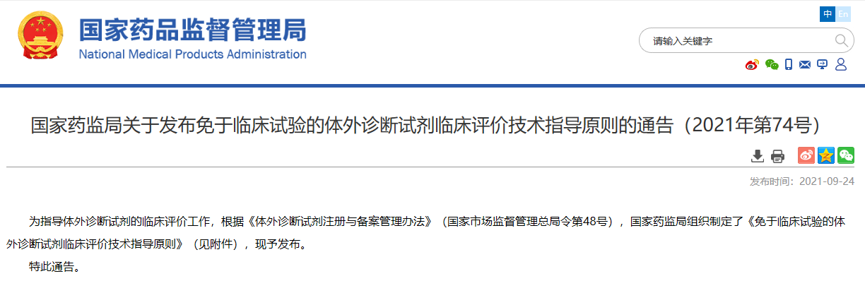 關(guān)于發(fā)布免于臨床試驗的體外診斷試劑臨床評價技術(shù)指導(dǎo)原則的通告(2021年第74號)