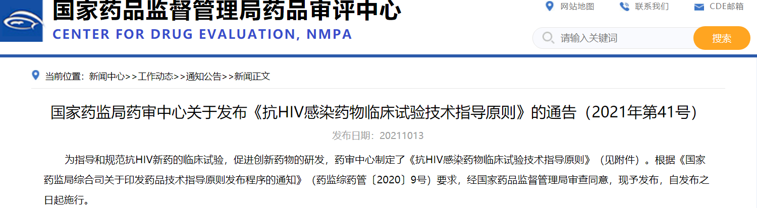 國家藥監(jiān)局藥審中心關(guān)于發(fā)布《抗HIV感染藥物臨床試驗技術(shù)指導(dǎo)原則》的通告(2021年第41號)