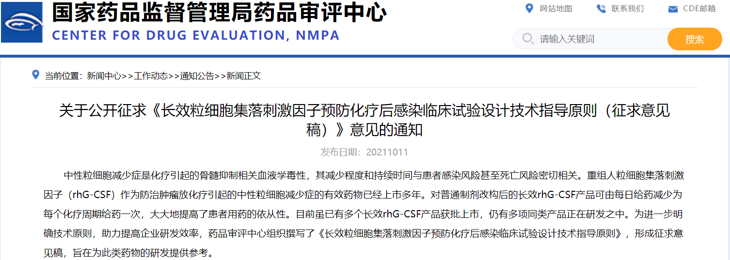 關(guān)于公開征求《長效粒細(xì)胞集落刺激因子預(yù)防化療后感染臨床試驗設(shè)計技術(shù)指導(dǎo)原則(征求意見稿)》意見的通知