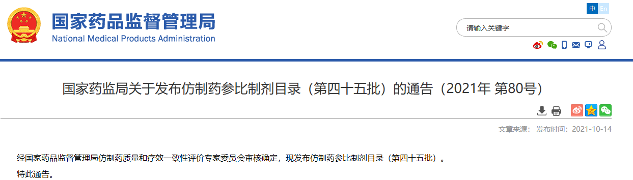 國家藥監(jiān)局關(guān)于發(fā)布仿制藥參比制劑目錄(第四十五批)的通告(2021年 第80號)