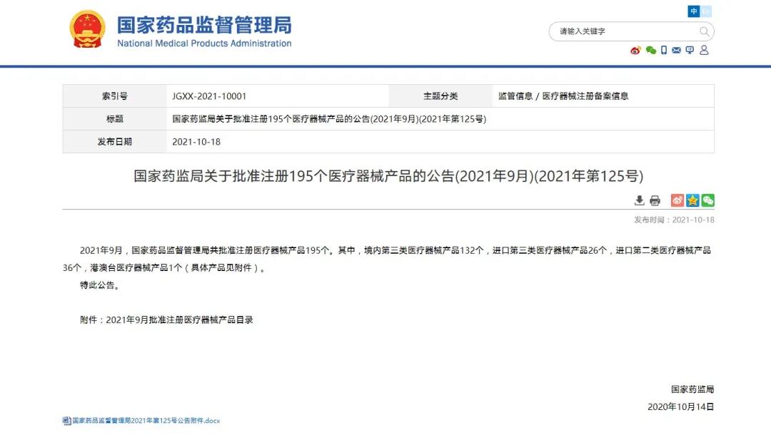 國家藥監(jiān)局關于批準注冊195個醫(yī)療器械產品的公告(2021年9月)(2021年第125號)