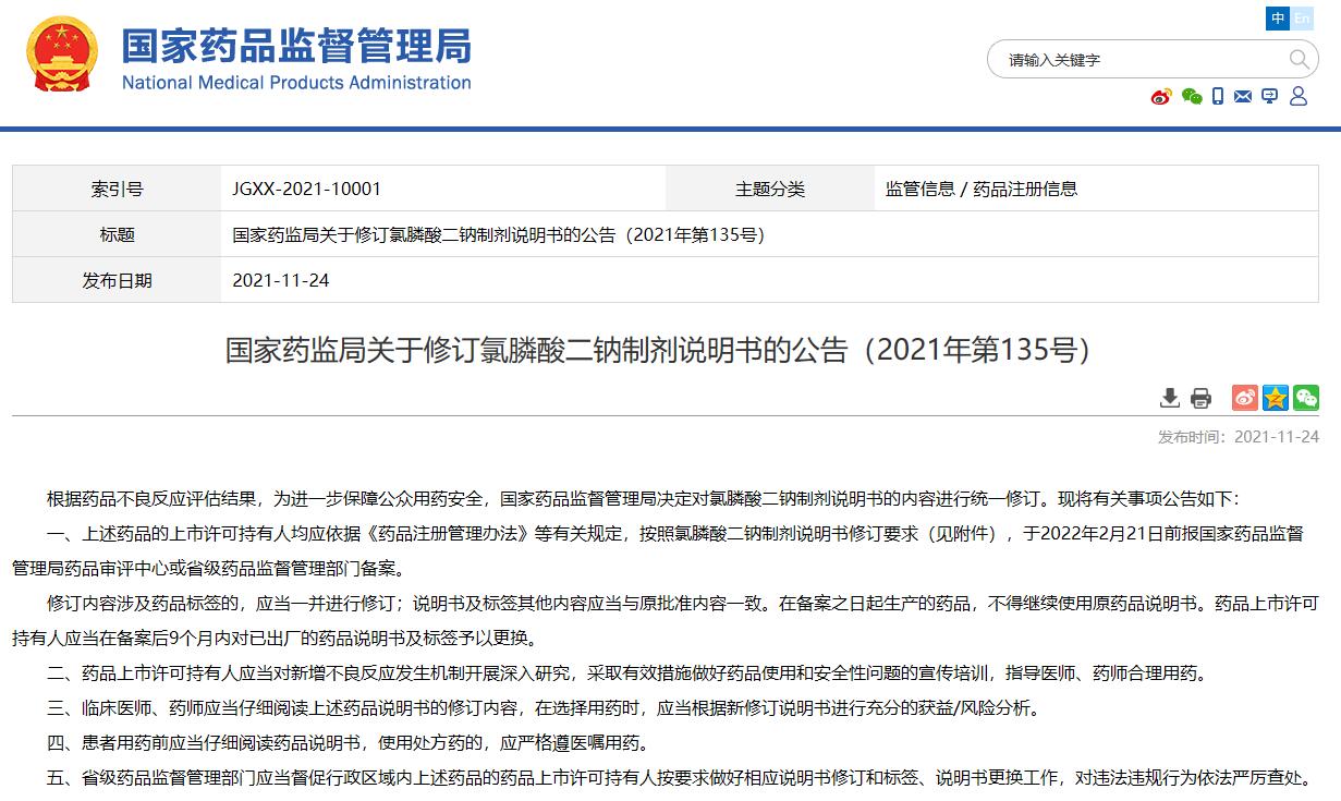 國家藥監(jiān)局關(guān)于修訂氯膦酸二鈉制劑說明書的公告(2021年第135號(hào))