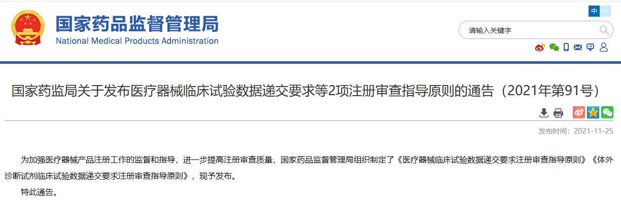 國家藥監(jiān)局關(guān)于發(fā)布醫(yī)療器械臨床試驗(yàn)數(shù)據(jù)遞交要求等2項(xiàng)注冊(cè)審查指導(dǎo)原則的通告(2021年第91號(hào))