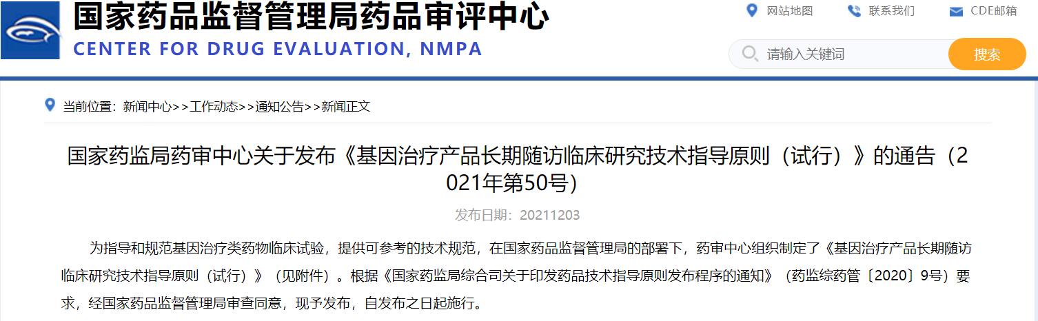 國(guó)家藥監(jiān)局藥審中心關(guān)于發(fā)布《基因治療產(chǎn)品長(zhǎng)期隨訪臨床研究技術(shù)指導(dǎo)原則(試行)》的通告(2021年第50號(hào))