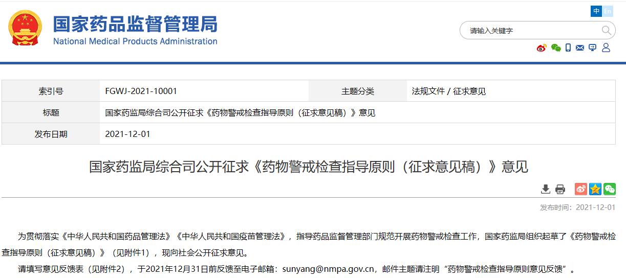 國(guó)家藥監(jiān)局綜合司公開(kāi)征求《藥物警戒檢查指導(dǎo)原則(征求意見(jiàn)稿)》意見(jiàn)
