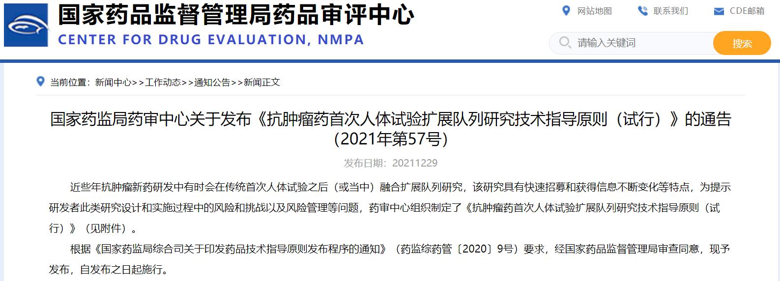 國(guó)家藥監(jiān)局藥審中心關(guān)于發(fā)布《抗腫瘤藥首次人體試驗(yàn)擴(kuò)展隊(duì)列研究技術(shù)指導(dǎo)原則(試行)》的通告(2021年第57號(hào))