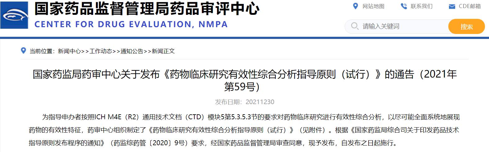 國(guó)家藥監(jiān)局藥審中心關(guān)于發(fā)布《藥物臨床研究有效性綜合分析指導(dǎo)原則(試行)》的通告(2021年第59號(hào))