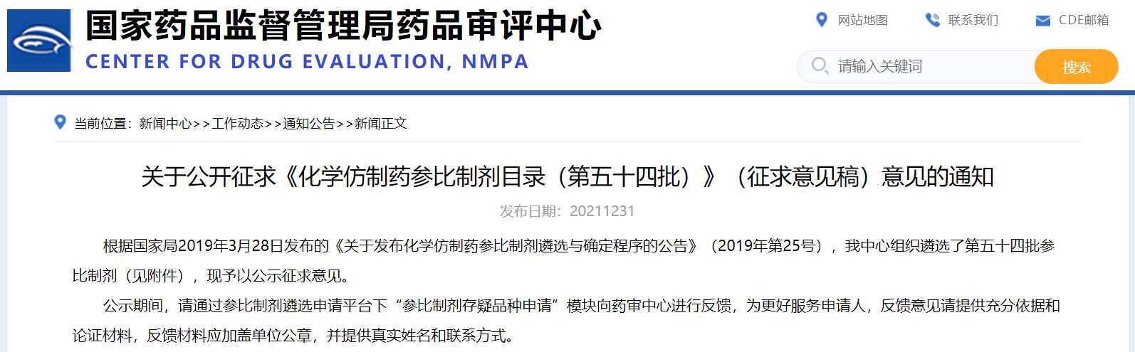 關(guān)于公開征求《化學(xué)仿制藥參比制劑目錄(第五十四批)》(征求意見稿)意見的通知