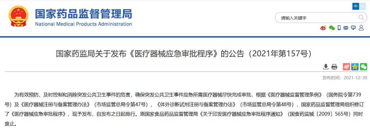 國(guó)家藥監(jiān)局關(guān)于發(fā)布《醫(yī)療器械應(yīng)急審批程序》的公告(2021年第157號(hào))