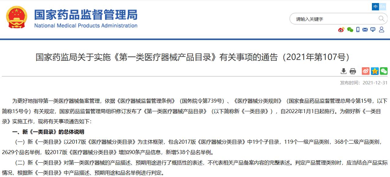 國(guó)家藥監(jiān)局關(guān)于實(shí)施《第一類醫(yī)療器械產(chǎn)品目錄》有關(guān)事項(xiàng)的通告(2021年第107號(hào))