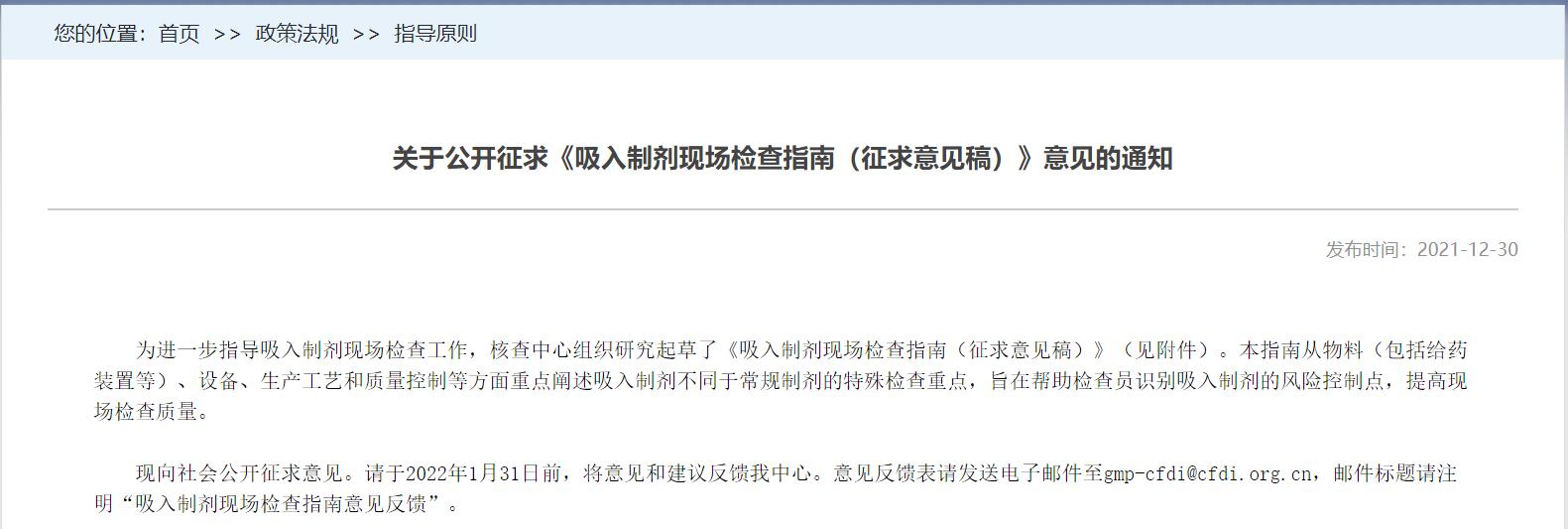 關(guān)于公開征求《吸入制劑現(xiàn)場(chǎng)檢查指南(征求意見稿)》意見的通知