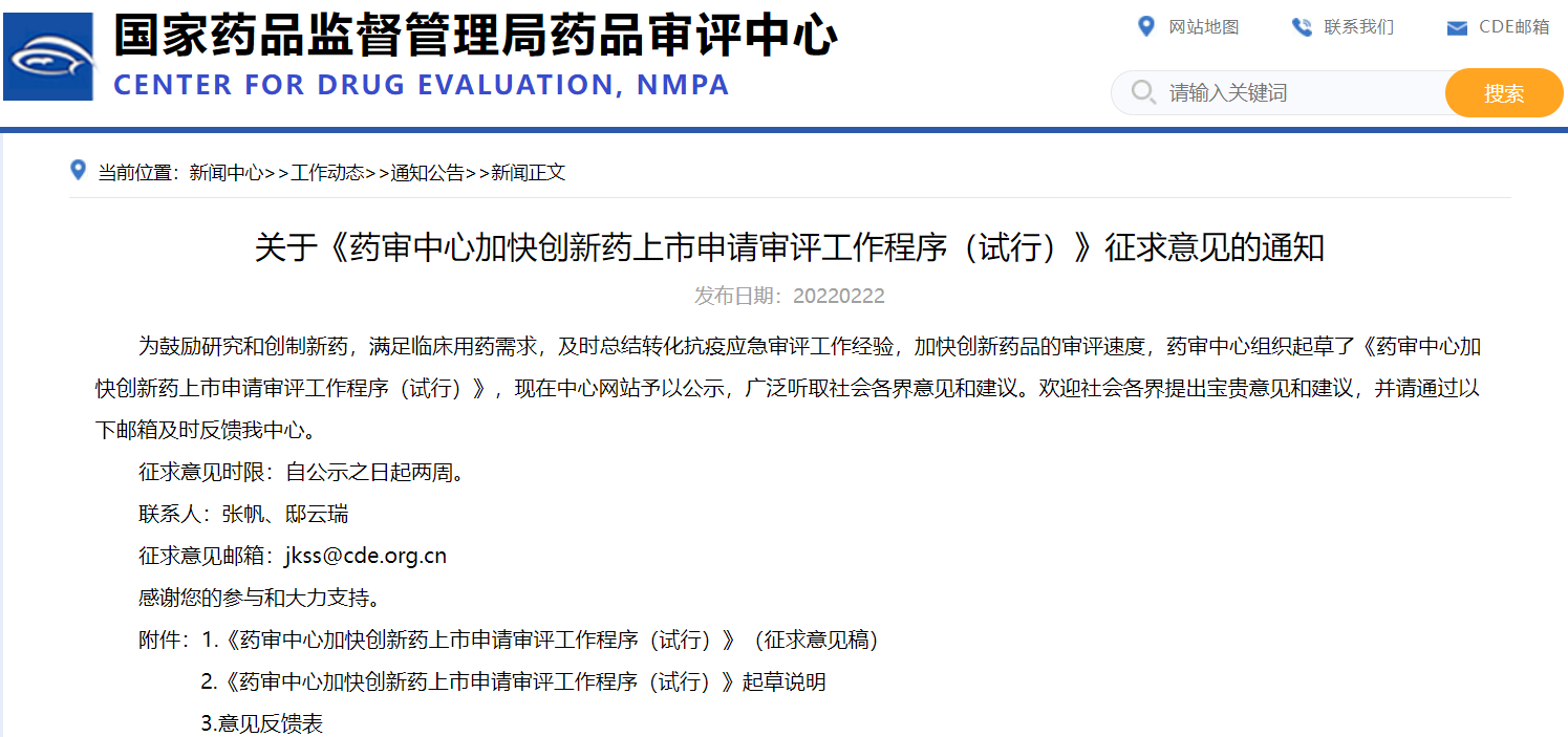 關(guān)于《藥審中心加快創(chuàng)新藥上市申請(qǐng)審評(píng)工作程序(試行)》征求意見的通知