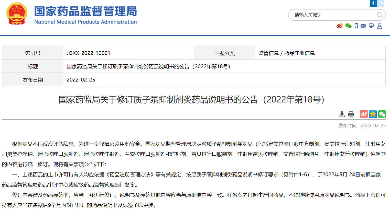 國(guó)家藥監(jiān)局關(guān)于修訂質(zhì)子泵抑制劑類藥品說明書的公告(2022年第18號(hào))