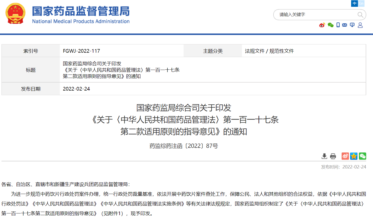 國(guó)家藥監(jiān)局綜合司關(guān)于印發(fā) 《關(guān)于〈中華人民共和國(guó)藥品管理法〉第一百一十七條 第二款適用原則的指導(dǎo)意見》的通知