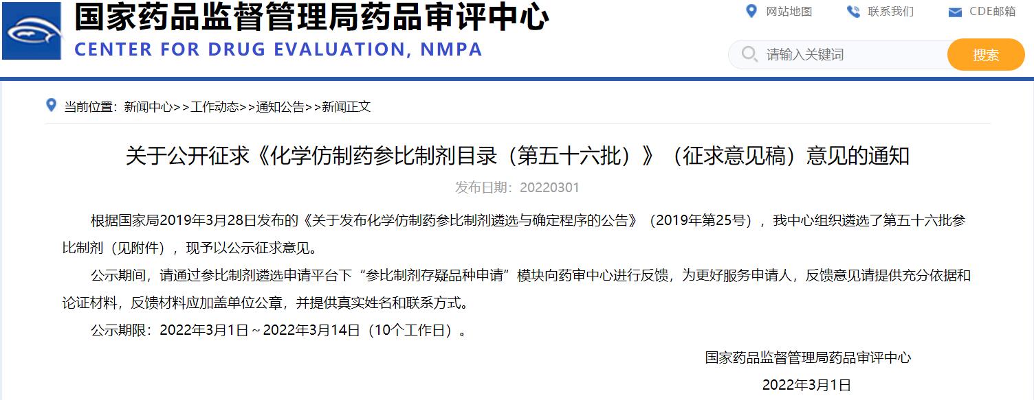 關于公開征求《化學仿制藥參比制劑目錄(第五十六批)》(征求意見稿)意見的通知