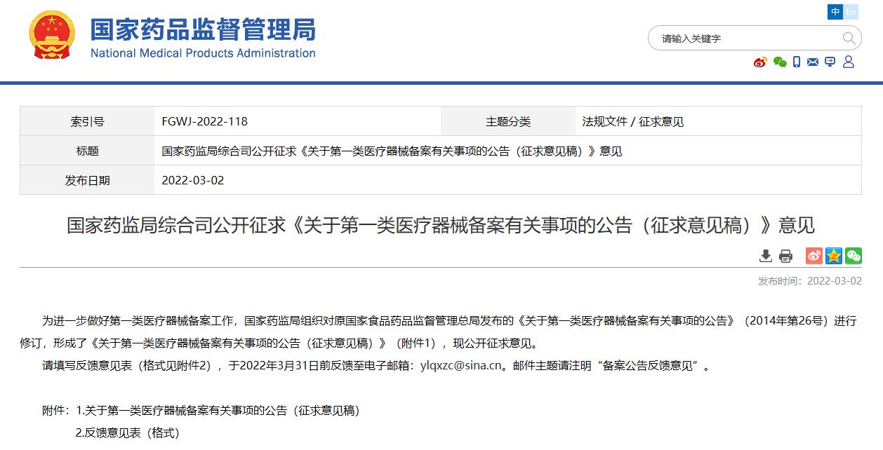 國家藥監(jiān)局綜合司公開征求《關于第一類醫(yī)療器械備案有關事項的公告(征求意見稿)》意見