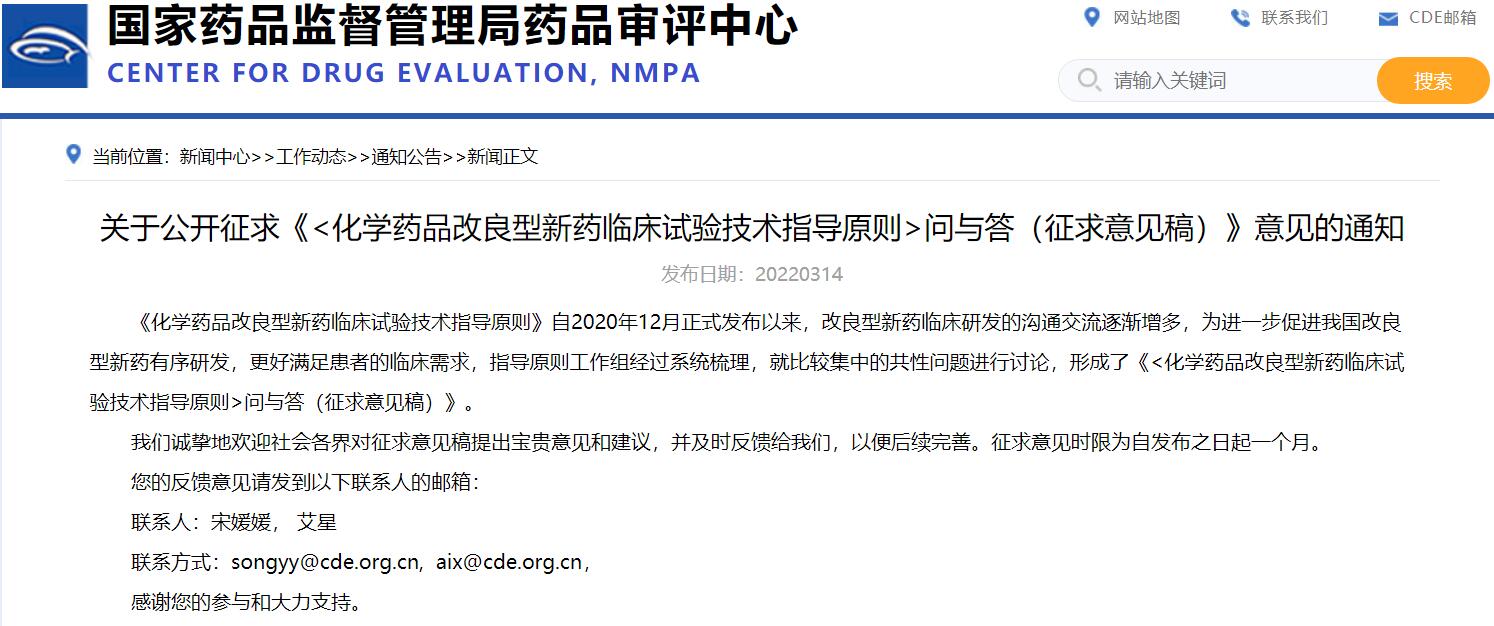 關(guān)于公開征求《<化學(xué)藥品改良型新藥臨床試驗(yàn)技術(shù)指導(dǎo)原則>問與答(征求意見稿)》意見的通知